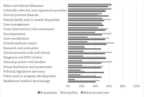 For example, among respondents working with clinical students, it was not surprising that clinical practice theories, diagnosis and Diagnostic and Statistical Manual (DSM) criteria, clinical practice interventions with individuals, and crisis intervention/risk assessment were among the most frequently selected knowledge and skills expected of graduates. Ethics and ethical dilemmas, interdisciplinary teams, and culturally relevant/antioppressive practice were also frequent responses. As indicated in Figure 1, students are likely to gain knowledge and skills in many of the advanced competency areas in most placements. Notable exceptions are research and evaluation, and legislative advocacy, which suggests that clinical students will develop competency in these areas through coursework rather than practicum placements.
