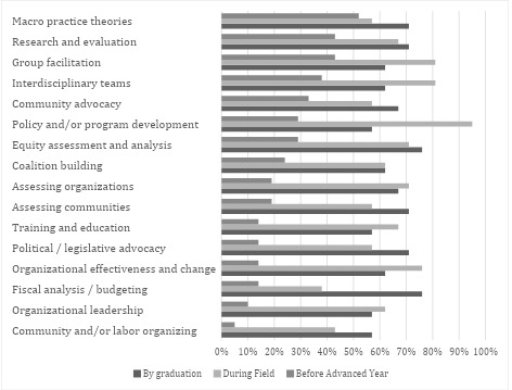 More than half of respondents who work with macro students expect students to graduate with equity assessment and analysis, fiscal analysis and budgeting, macro practice theories, research and evaluation, political or legislative advocacy, and community assessment skills (see Figure 2). Students are likely to gain knowledge and skills in many of the advanced competency areas in most placements. However, there are several areas that students are unlikely to practice in a majority of practicum placements: fiscal analysis/budgeting, political/legislative advocacy, and to a lesser extent, community and/or labor organizing. This suggests that macro students will develop competency in these areas through coursework, rather than practicum placements.