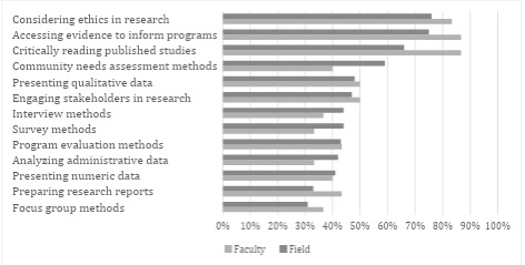 A final vulnerability identified from this analysis relates to the research curriculum, which has historically included a two-course sequence that emphasizes quantitative study design. The surveys distributed to both practicum partners and to faculty included a subset of questions related to expectations of students’ research preparation. Both faculty and practicum instructors were asked “How important is it that MSW students graduate with the following research skills?” Faculty chose from one of the following answer choices for each area: very important for all students, very important for some students, or not important). Practicum respondents chose from the following answer choices: very important, somewhat important, or not important. Figure 3 indicates the percentage of faculty who rated each area as“very important for all students”and the percentage of practicum respondents who rated each area as “very important.”