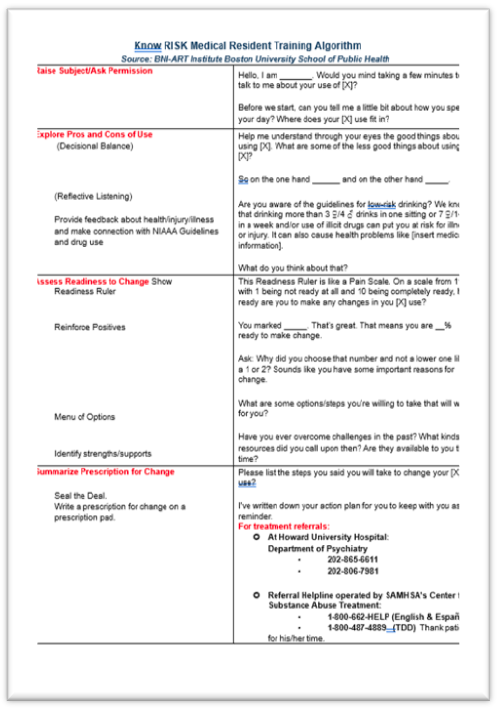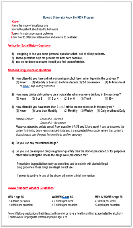 Through the HU SBIRT training program, graduate social work students are trained on the KNOW the RISK application, which emphasizes (R) raise the issue of substance use, (I) inform the client about healthy behaviors, (S) screen for substance use problems, and (K) know how to offer brief intervention (Kalu et al., 2016). The KNOW the RISK algorithm was developed by an interdisciplinary group of providers, including social workers, within Howard University to facilitate SBIRT training and prepare health and social service professional students to engage in culturally sensitive assessment and identification of substance use disorder. SBIRT faculty incorporate discussion and dialogue regarding barriers to screening for substance misuse, such as stigma, provider bias, and mistrust.